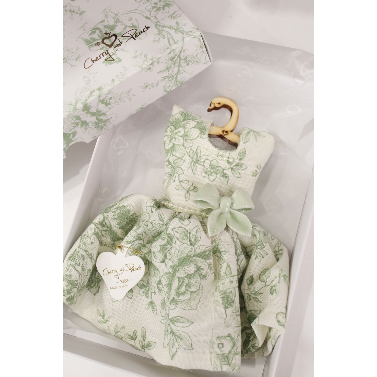 Questo raffinato vestito profuma biancheria, realizzato a mano in Italia, combina eleganza e funzionalità. Il tessuto Bianco Damascato Verde è impreziosito da un fiocco bianco/verdino in porcellana Capodimonte e perle decorative, perfetto per donare un tocco di classe ai tuoi ambienti. L'intenso profumo che rilascia lo rende ideale per armadi e cassetti, mantenendo il bucato fresco e profumato.